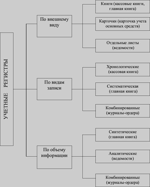 Хозяйственные операции должны отражаться в регистрах бухгалтерского учета в хронологической последовательности и группироваться по соответствующим счетам бухгалтерского учета. Процесс записи хозяйственных операций в учетные регистры называется учетной регистрацией. Правильность отражения хозяйственных операций в регистрах бухгалтерского учета обеспечивают лица, составившие и подписавшие их. Содержание регистров бухгалтерского учета и внутренней бухгалтерской отчетности является коммерческой тайной, а в случаях, предусмотренных законодательством Российской Федерации, - государственной тайной. Лица, получившие доступ к информации, содержащейся в регистрах бухгалтерского учета и во внутренней бухгалтерской отчетности, обязаны хранить коммерческую и государственную тайну. За ее разглашение они несут ответственность, установленную законодательством Российской Федерации. Регистры бухгалтерского учета могут вестись в специальных книгах (журналах, журналах-ордерах, ведомостях), на отдельных листах и карточках, а также на машинных носителях информации (дисках, дискетах и иных машинных носителях). При ведении регистров бухгалтерского учета на машинных носителях информации должна быть предусмотрена возможность их вывода на бумажные носители информации. Синтетический учет осуществляется в так называемых синтетических регистрах, а аналитический учет - в аналитических регистрах. Записи по синтетическим счетам, как правило, ведутся в журналах-ордерах и Главной книге, а по аналитическим счетам - в книгах или на карточках. При ведении аналитического учета на карточках каждая вновь открываемая карточка регистрируется в особом реестре карточек, который дает возможность следить за их сохранностью. При хранении регистров бухгалтерского учета должна обеспечиваться их защита от несанкционированных исправлений. Исправление ошибки в регистре бухгалтерского учета должно быть обосновано и подтверждено подписью лица, внесшего исправление, с указанием даты исправления. Основное назначение учетных регистров - это осуществление контроля за хозяйственной деятельностью предприятия, последующего экономического анализа и подготовки рекомендаций с целью принятия управленческих решений. По данным, приведенным в учетных регистрах, определяется финансовый результат работы предприятия. Также учетные регистры предназначены для систематизации и накопления информации, содержащейся в принятых к учету первичных документах, для отражения на счетах бухгалтерского учета и в бухгалтерской отчетности. Формы регистров бухгалтерского учета разрабатываются и рекомендуются Министерством финансов Российской Федерации, органами, которым федеральными законами предоставлено право регулирования бухгалтерского учета, или федеральными органами исполнительной власти, организациями при соблюдении ими общих методических принципов бухгалтерского учета. Классификация учётных регистров Учетные регистры, применяемые в практике бухгалтерского учета, подразделяются по ряду признаков: внешнему виду, степени обобщения производимых записей, характеру. По внешнему виду учетные регистры делятся на бухгалтерские книги, карточки, свободные листы (ведомости), компьютерные распечатки. Бухгалтерские книги — сброшюрованные листы бумаги с 