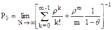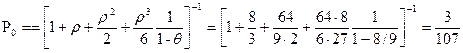 Пример расчета характеристик многоканальной СМО с бесконечной очередью. В Универсаме поток покупателей 40 в час (λ =40). Работают 3 кассы (m =3). Интенсивность обслуживания касс одинаковая и равна 15 покупателей в час (μ =15). Решение. ρ= λ/ μ = 8/3; θ= ρ/ m = 8/9.