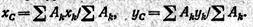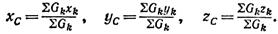 Gh=Akp, где Ak — площадь участка, р — сила тяжести единицы площади фигуры (интенсивность силы тяжести по площади фигуры). Подставив в формулу вместо Gk его значение Ahq, получим формулы координат центра тяжести фигуры, составленной из площадей: