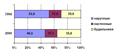 Рис. 3. Динамика удельного веса производства часов по видам в 2000 и 2008 гг. Построение секторной диаграммы начинается с определения центральных углов секторов. Сумма всех углов круга 360° соответствует 100%, тогда 1%=3,6°. 1990г.: 46,5×3,6°=167,4°; 17,7×3,6°=63,7°; 35,8×3,6°=128,9°. 1998г.: 52,6×3,6°=189,4°; 17,5×3,6°=63°; 29,9×3,6°=107,6°.