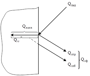 Поэтому лучеиспускательную способность тела также называют интегральной плотностью потока собственного излучения. Далее рассмотрим схему радиационного теплообмена, изображенную на рис.6.2. На непрозрачное тело падает лучистый поток Qпад. Одна часть теплового потока в количестве Qпогл поглощается телом, а другая – в количестве Qотр телом отражается. Тело обладает и собственным излучением Qсоб или Q. Радиационный тепловой поток, уходящий с поверхности тела, равный сумме собственного и отраженного тепловых потоков называют эффективным тепловым потоком и обозначают Qэф. Эффективный тепловой поток по определению равен: