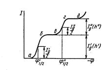 Это полярограмма для случая восстановления на катоде ионов меди, свинца и цинка. На этой кривой имеется несколько волн, каждая из которых характеризует разряд определенного иона. Разряд каждого иона характеризуется двумя величинами: предельным током i и потенциалом полуволны j1/2. Для среднего значения предельного тока за период жизни капли t имеется уравнение Ильковича: Id = 706zD1/2m2/3t1/6C0, где m -скорость вытекания ртути из капилляра; Id – сила предельного тока диффузии на поверхности ртутной капли; D – коэффициент диффузии; t - время от начала образования капли; С - концентрация. Из этого уравнения следует, что величина Id прямо пропорциональна концентрации разряжающихся веществ, находящихся в растворе. На этом важном следствии из уравнения основан количественный полярографический анализ. Для потенциала катодной полярографической волны существует следующее уравнение: j = j0 + ln(Id –I)/I. При силе тока I = j1/2 = j0 . Т.е. потенциал полуволны равен стандартному электродному потенциалу. На этом основан качественный полярографический анализ.