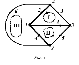 что и должно иметь место. 2. Контурная матрица (матрица контуров) – это таблица коэффициентов уравнений, составленных по второму закону Кирхгофа. Строки контурной матрицы В соответствуют контурам, а столбцы – ветвям схемы. Элемент bij матрицы В равен 1, если ветвь j входит в контур i и ее ориентация совпадает с направлением обхода контура, -1, если не совпадает с направлением обхода контура, и 0, если ветвь j не входит в контур i. Матрицу В, записанную для главных контуров, называют матрицей главных контуров. При этом за направление обхода контура принимают направление ветви связи этого контура. Выделив в нашем примере (см. рис. 5) дерево, образуемое ветвями 2-1-4, запишем коэффициенты для матрицы В.
