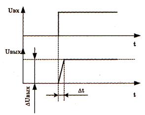 Выводы операционного уселителя: инвертирующий, неинвертирующий, выводы для подключения двуполярного источника питания и выводы для подключения цепей коррекции. ОУ подразделяются по следующим признакам: 1. общего применения; 2. мощные; 3. с управляемыми параметрами; 4. быстродействующие; 5. изолирующие - используют для обеспечения гальванической развязки каскадов. Основные параметры ОУ: 1. напряжение источника питания +U и -U. Питание в основном двуполярное, обычно от ± 6 до ± 18 В, наиболее распространенное напряжение питания -+ 12 и ± 15 В; 2. максимальное выходное напряжение - если не оговорено отдельно в справочных данных, его принимают меньшим, или равным модулю напряжения питания за вычетом падения напряжения на ОУ, составляющим от 1 до 2 В; 3. сопротивление нагрузки обычно составляет от 1 до 2 кОм; 4. дифференциальный коэффициент усиления по напряжению; 5. входное сопротивление ОУ. Входное дифференциальное сопротивление - входное сопротивление для разностного сопротивления между инвертирующим и неинвертирующим входами. Его величина может достигать от сотен килом до единиц мегом; 6. потребляемый от источника питания ток или потребляемая мощность; 7. входной ток ОУ. Для ОУ, выполненных на биполярных транзисторах, входной ток может составлять единицы микроампер, а для ОУ, выполненных на полевых транзисторах, еще меньше; 8. напряжение смещения, или сдвига - такое напряжение, которое нужно подать на входы ОУ, чтобы при отсутствии сигнала на входах выходное напряжение ОУ было равно 0. Величина напряжения сдвига находится в диапазоне от 3 до 10 мВ для входного каскада на биполярных транзисторах и от 30 до 100 мВ для входного каскада на полевых транзисторах; 9. выходное сопротивление ОУ обычно составляет несколько сотен ом и указывается в справочниках; 10. коэффициент ослабления синфазного сигнала для ОУ обычно составляет от 70 до 80 дБ; 11. скорость нарастания выходного напряжения показывает быстродействие ОУ (рис.10.5) и находится по формуле Kп = ΔUвых/Δt [В/мкС].