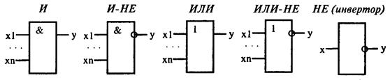 Логический элемент (логический вентиль) – это электронная схема, выполняющая некоторую простейшую логическую операцию. На рис.11.12 приведены примеры условных графических обозначений некоторых логических элементов.