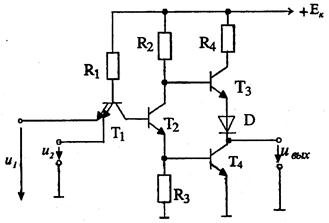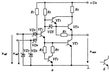 Для конкретной серии микросхем характерно использование типового электронного узла – базового логического элемента. Этот элемент является основой построения самых разнообразных цифровых электронных устройств. Базовый элемент ТТЛ содержит многоэмиттерный транзистор, выполняющий логическую операцию И, и сложный инвертор (рис. 11.13).