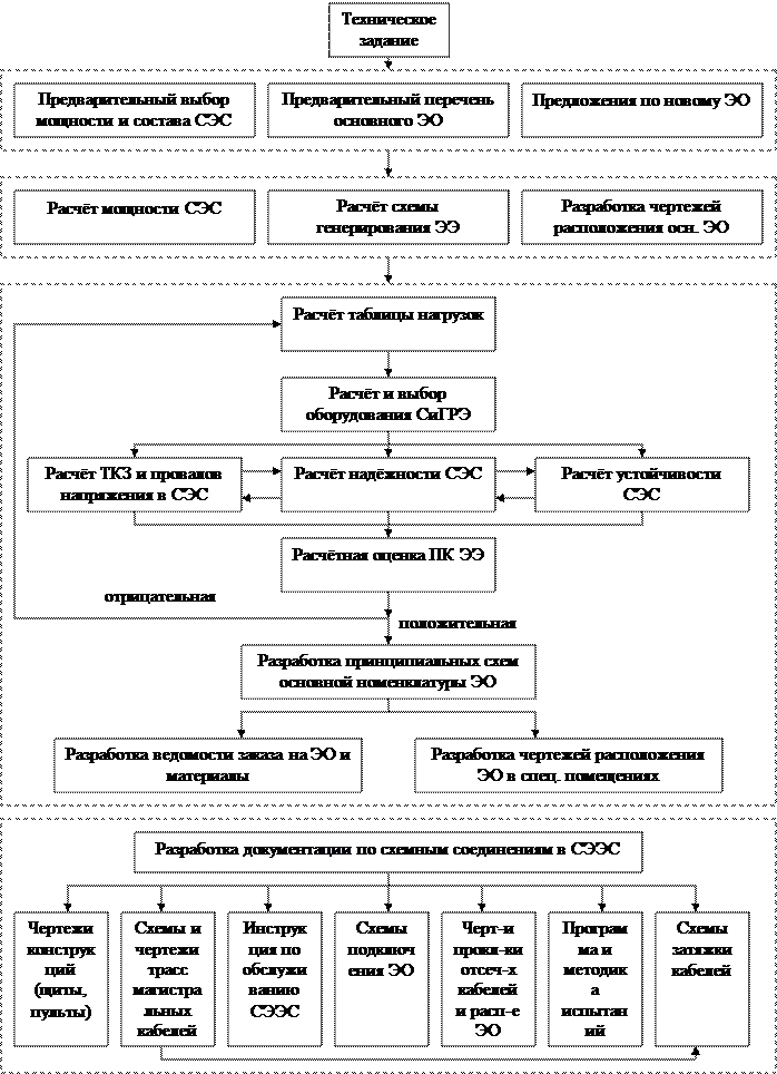 Традиционный подход к проектированию СЭЭС. При традиционном подходе стадии проектирования представляют собой ряд последовательных приближений к информации, которая дает возможность выпустить рабочие документы для завода-изготовителя. В соответствии с ЕСКД, можно выделить следующие стадии проектирования СЭЭС: Ø разработка технического задания, Ø разработка технического предложения, Ø эксплуатационный проект, Ø технический проект, Ø рабочий проект (рабочая документация).