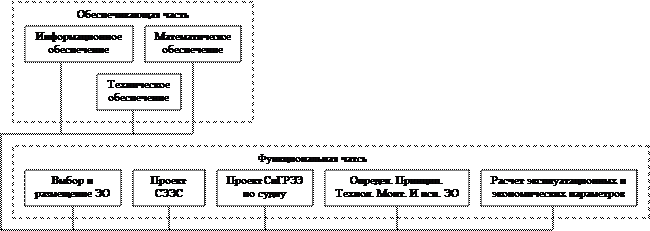 · Основная часть – информационное обеспечение – база данных которая содержит необходимые сведения для решения проектных задач (каталоги, массивы информации); специальные программы, обеспечивающие работу БД – контроль ввода, поиск информации, корректирование массивов и т.д.; информационные модели проектируемых систем, дополняемые в процессе проектирования. Информационное обеспечение дает возможность постоянно накапливать, обрабатывать, хранить и выдавать любую информацию документы, обращающиеся в системе. · Математическое обеспечение – включает комплекс математических моделей, алгоритмов и программ, по определению различных параметров СЭЭС и осуществлению самого процесса проектирования; используется как общая (базовая), так и прикладное программное обеспечение. · Техническое обеспечение – включает ЭВМ, периферийные устройства и линии связи в требуемом объеме. · Функциональная часть – это ряд подсистем, которые в процессе проектирования могут уточняться, как по количеству, так и по содержанию.