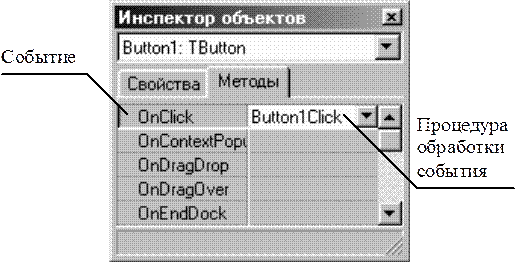 События для элементов можно задать на вкладке «События» панели «Инспектор объектов». Процедура обработки события автоматически описывается в классе формы и разделе реализации модуля. В ранее рассмотренном примере в классе TFrom1 нажатие кнопки обрабатывается процедурой Процедуры обработки событий, задаются на вкладке «События» в панели «Инспектор объектов»:
