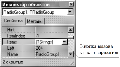 Для задания списка вариантов необходимо на вкладке свойств инспектора объектов нажать на кнопку с изображением многоточия, появляющуюся при выборе свойства Items: