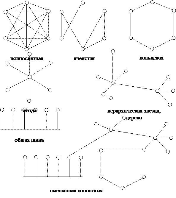 Полносвязная топология соответствует сети, в которой каждый компьютер непосредственно связан со всеми остальными. Несмотря на логическую простоту, этот вариант громоздок и неэффективен. Каждый ПК должен иметь большое количество коммуникационных портов, достаточное для связи с каждым из остальных ПК сети. Для каждой пары ПК должна быть выделена отдельная физическая линия связи. В крупных сетях используется редко. Ячеистая топология получается из полносвязной путем удаления некоторых возможных связей. Допускает соединение большого количества ПК и характерна, как правило, для крупных сетей. Кольцевая конфигурация: данные передаются по кольцу от одного ПК к другому. Главное достоинство кольца – по своей природе обладает свойством резервирования связей (любая пара узлов связана двумя путями – по и против часовой стрелки). Оборот данных по кольцу позволяет отправителю контролировать процесс доставки данных адресату. Это же свойство используется для тестирования связности сети и поиска узла, работающего некорректно. Недостаток: необходимо принимать специальные меры, чтобы в случае выхода из строя или отключения какого-либо ПК не прерывался канал связи между остальными ПК. Топология звезда образуется в случае, когда каждый ПК подключается отдельным кабелем к общему центральному устройству – концентратору. В качестве концентратора может выступать как компьютер, так и специализированное устройство – многовходовый повторитель, коммутатор, маршрутизатор. Недостатки: более высокая стоимость сетевого оборудования из-за необходимости приобретения специализированного центрального устройства; возможности по наращиванию количества узлов в сети ограничиваются количеством портов концентратора. Иерархическая звезда, или дерево: сеть с использованием нескольких концентраторов, соединенных между собой иерархическими связями типа "звезда". В настоящее время является самым распространенным типом топологии связей, как в локальных, так и в глобальных сетях. Конфигурация общая шина: частный случаи топологии "звезда"; в качестве центрального элемента выступает пассивный кабель, к которому по схеме "монтажного ИЛИ" подключается несколько ПК. Передаваемая информация распространяется по кабелю и доступна одновременно всем ПК, присоединенным к этому кабелю. Основное преимущество – дешевизна и простота наращивания (присоединения новых узлов к сети). Недостатки: низкая надежность: любой дефект кабеля или какого-нибудь из его разъемов полностью парализует всю сеть; невысокая производительность: в каждый момент времени только один ПК может передавать данные по сети, поэтому пропускная способность канала всегда делится между всеми узлами сети. До недавнего времени общая шина была самой распространенной топологией для локальных сетей. Небольшие сети имеют, как правило, типовую топологию, для крупных сетей характерно наличие произвольных связей между ПК. В таких сетях можно выделить отдельные, произвольно связанные фрагменты (подсети), имеющие типовую топологию, поэтому их называют сетями со смешанной топологией. Сетевой уровень Служит для образования единой транспортной системы, объединяющей несколько сетей, причем эти сети могут использовать совершенно разные принципы передачи сообщений между конечными узлами и облада