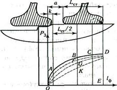 Рис. 2. Теоретическая диаграмма запрессовки колеса на ось Дальнейшее продвижение оси в ступицу до ее середины будет сопровождаться дальнейшим достаточно высоким ростом усилия запрессовки Р3 (участок АВ). Рост Р3 на участке АВ происходит за счет роста сил на деформацию ступицы колеса, жесткость которой по мере продвижения к середине увеличивается, из-за конусности наружной поверхности ступицы. При дальнейшем продвижении оси интенсивность роста Р3 уменьшается (участок ВС) вследствие последующего снижения жесткости ступицы. С момента выхода запрессовочного конуса оси из-под ступицы колеса и до окончания процесса запрессовки рост усилия запрессовки прекращается. Таким образом, при цилиндрической форме поверхностей изменение усилий запрессовки характеризуется линией OABCDE диаграммы. При цилиндрической форме подступичной части и допустимой конусности отверстия ступицы величина натяга возрастает по мере увеличения длины сопрягаемых поверхностей, а рост Р3 идет по кривой OFCDE. При конической форме подступичной части оси и цилиндрическом отверстии ступицы изменение усилий запрессовки соответствует кривой OGDE. При конической форме подступичной части оси и отверстия ступицы изменение усилий запрессовки происходит по кривой OKDE. При прессовой посадке колес на оси обычно до 25...30% напрессовок имеет несоответствие напрессовочных усилий нормам или отклонения формы диаграммы от допустимой. Это объясняется неустойчивостью процесса трения при напрессовке. Кроме того, при прессовой посадке иногда возникают механические повреждения сопрягаемых поверхностей, снижающие усталостную прочность колесных пар.