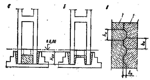 Рис.7. Конструкции соединения двухветвевой колонны с фундаментом: а - в одном общем стакане; б - в двух отдельных стаканах; в - при устройстве шпонок; 1 - бетон замоноличивания; 2 – колонна
