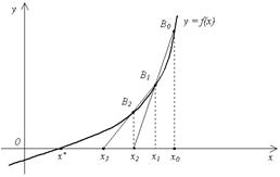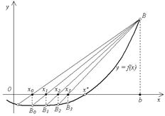 Рассмотрим еще одну модификацию метода Ньютона. Пусть известно, что простой корень x * уравнения f (x) = 0 находится на отрезке [ a, b ] и на одном из концов отрезка выполняется условие f (x) f" (x) ³ 0. Возьмем эту точку в качестве начального приближения. Пусть для определенности это будет b. Положим x 0 = a. Будем проводить из точки B = (b, f (b)) прямые через расположенные на графике функции точки Bn с координатами (xn, f (xn), n = 0, 1, …. Абсцисса точки пересечения такой прямой с осью OX есть очередное приближение xn+ 1. Геометрическая иллюстрация метода приведена на рис. 2.10.