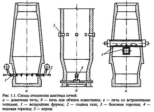 Система отопления печей для плавки чугуна в литейных печах (в вагранках) аналогична системе отопления доменных печей, но в ней практически не используется подогретый воздух. В вагранках применяется дополнительный обогрев камер-копильников, в которые стекает расплавленный металл. Шахтные печи для обжига огнеупорного сырья или известняка также работают по принципу противотока. Выгружаемый обожженный материал отдает тепло воздуху, всасываемому в печь через разгрузочные отверстия печи. По мере продвижения воздуха снизу вверх температура воздуха повышается. В поток воздуха через специальное центральное устройство, установленное в месте разгрузки материала, вводится также газ. Газовоздушная смесь после прогрева до температуры воспламенения загорается и сгорает в слое подогреваемого материала, производя его обжиг. Поднимаясь далее вверх, продукты сгорания отдают тепло порциям загружаемой шихты. Особенностью такой системы сжигания является практическая невозможность контроля процесса горения газа в слое. Качество сжигания газа и обжига зависит не только от качества смешения газа с воздухом, но и от фракционного состава загружаемого материала и равномерности его распределения по сечению печи. Для компенсации неравномерности отжига, создаваемой центральной горелкой, применяют дополнительный ввод топлива через периферийные горелки или газовоздушные сопла (рис. 1.1, б). Лучшая равномерность обжига в шахтных печах достигается при наличии в них специальных кернов, в которых выполнены каналы для равномерного распределения продуктов сгорания в слое. Продукты сгорания получают при помощи горелочных устройств, устанавливаемых за пределами печи (рис. 1.1, в).