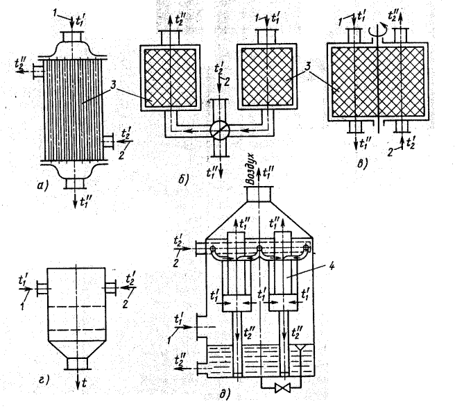 . В рекуперативных поверхностных ТА обменивающиеся теплотой среды 1 и 2 протекают одновременно и передача теплоты происходит через разделяющую их поверхность 3 (рис 1.1, а). Рекуперативные ТА наиболее распространены, их используют в самых различных областях техники. В регенеративных ТА (рис. 1.1, б, в) поверхность 3 теплообмена по очереди омывается то греющим 1, то нагреваемым 2 теплоносителем. Такие ТА применяют главным образом для подогрева газообразных компонентов горения, а также в криогенной технике. В качестве поверхности теплообмена в регенеративном ТА используется теплоаккумулирующая насадка, элементы которой, например, в виде шаров, решеток, колец, образуют каналы сложной формы для прохождения теплоносителей. Поверхность теплообмена регенеративного ТА может быть выполнена переключающейся (рис. 1.1, б) через определенный промежуток времени или вращающейся (рис. 1.1, в). В контактных ТА передача теплоты от греющего теплоносителя к нагреваемому происходит при непосредственном их контакте. Контактные ТА делят на смесительные и барботажные. В аппаратах смесительного типа (рис. 1.1, г) нагреваемый 2 и греющий 1 теплоносители перемешиваются. В барботажных аппаратах греющий теплоноситель прокачивается через нагреваемый, или наоборот, не смешиваясь с ним. В барботажном ТА (рис. 1.1, д) горячий воздух 1 направляется в теплообменные элементы 4, по внутренней цилиндрической поверхности которых закрученным тонким слоем стекает вода 2. Воздух, проходя через слой воды, разрывает её поток на отдельные пленки и при непосредственном контакте с водой охлаждается.