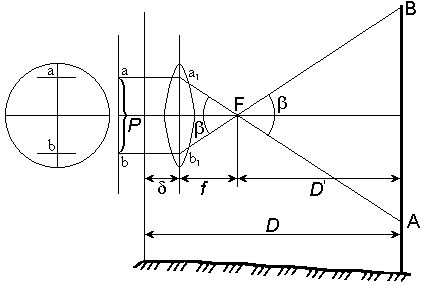 Рис. 56. Схема определения расстояний оптическим нитяным дальномером D = D' + f + δ где D ' – расстояние от переднего фокуса объектива до рейки, f – фокусное расстояние объектива, δ - расстояние от оси вращения теодолита до объектива. Рассмотрим подобные треугольники АВF и а1b1F (рис. 56) ав /АВ = f /D' где а b = P – расстояние между дальномерными нитями, АВ = n – число сантиметровых делений между дальномерными нитями на рейке. Тогда D' = f /P ∙ n D = D' + f + δ = f /P ∙ n + f + δ Отношение f /P называется коэффициентом дальномера и обозначается K, а сумма (f +δ) – постоянная дальномера и обозначается С. Тогда D = K ∙ n + С. Дальномерные нити наносят так, чтобы при сантиметровых делениях коэффициент дальномера К = 100. Обычно при f объектива равном 200 мм P берут равным 2 мм, тогда K = 100. В современных теодолитах постоянная дальномера С близка к нулю, поэтому число метров в измеряемом расстоянии равно числу метров в дальномерном отсчете D = K ∙ n = 100 ∙ n. При K = 100 и n = 124,3 см, D = 100 ∙ 124,3 см = 124,3 м.
