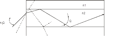 Уменьшая произведение этих величин, можно добиться распространения по световоду лишь одной моды. В этом случае волоконный световод называется одномодовым. Имеется много типов структур световодов, однако наибольшее распространение получили три типа: многомодовые со ступенчатым профилем показателя преломления, многомодовые с градиентным профилем показателя преломления и одномодовые. В одномодовых световодах обычно 2а» 5 – 10 мкм (для ближнего ИК-диапазона), в многомодовых – от нескольких десятков до нескольких сотен мкм. Разность Dn для многомодовых световодов составляет ~ 1-2%, для одномодовых – несколько десятых долей процента. Полный диаметр световодов составляет ~ 102 – 103 мкм. Распространение света по волоконному световоду обусловлено полным внутренним отражением света на границе сердцевина-оболочка. Когда были учтены волновые свойства света, было обнаружено, что из континуума световых лучей в пределах угла полного внутреннего отражения от границы направляющей структуры только ограниченное число лучей с дискретными углами могут образовывать направляемые волны структуры. Кроме полного внутреннего отражения эти лучи должны удовлетворять ещё условию, которое заключается в том, что после двух последовательных переотражений от стенок соответствующие лучам волны должны быть в фазе и таким образом интерферировать при наложении друг на друга. Только когда волны удовлетворяют такому фазовому условию, они будут подчиняться структуре и формировать самосогласованное распределение поля направленных волн (мод). Если это условие не выполняется, волны интерферируют так, что гасят сами себя и исчезают. Квантование волн в дискретный ряд направляемых мод было обнаружено только тогда, когда были решены уравнения Максвелла для некоторых частных видов направляющих структур. Лучи, падающие на границу сердцевина-оболочка под углом < Q, где Sin Q = 1/n1. (n12 – n22)1/2, испытывают полное внутреннее отражение, приводя к зигзагообразному распространению света вдоль световода (рис. 35).