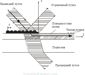 При легировании материала подложки изменяется показатель преломления слоя, чем больше концентрация примеси, тем меньше показатель преломления. Локализация света в волноводе обусловлена полным внутренним отражением на граничных поверхностях. Обычно достаточно, чтобы показатели преломления слоёв отличались лишь на 10-2. Побираются такие сочетания n1, n2, n3, чтобы распространялась заданная мода. Чем меньше толщина планарного волновода, тем меньшее число мод будет распространяться в волноводе. Типичная толщина плёнки – 1 мкм. Существует несколько элементов связи для ввода световых пучков в планарный волновод: поперечные элементы связи и продольные. При поперечных элементах связи лазерный луч падает непосредственно на перпендикулярную ему плоскость волновода (поперечное сечение) z = 0, (рис. 39). Такая система называется элементом «прямого типа». В данном случае преобразование энергии пучка в необходимую поверхностную волну достигается путём согласования поля пучка, падающего слева на границу z = 0, с полем поверхностной волны, распространяющейся вправо от этой границы. Кривая распределения амплитуды светового пучка похожа на гауссову форму распределения лазерного пучка. Следовательно, необходимое согласование полей можно осуществить при помощи соответствующего уменьшения ширины входящего лазерного пучка, например путём соответствующего подбора геометрии линз. Таким образом, эти элементы связи могут иметь эффективность почти 100%. Однако на практике поперечную схему элементов связи сложно осуществить, в первую очередь, из-за малой толщины волноводной плёнки.