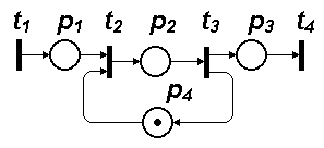 Рис. 4. Сеть Петри для примера 2 Пример 3 Требуется описать с помощью сети Петри процессы возникновения и устранения неисправностей в некоторой технической системе, состоящей из множества однотипных блоков; в запасе имеется один исправный блок; известны статистические данные об интенсивностях возникновения отказов и длительностях таких операций, как поиск неисправностей, замена и ремонт отказавшего блока. Поиск и замену отказавшего блока производит одна бригада, а ремонт замененного блока — другая бригада. Сеть Петри показана на рис. 5. Отметим, что при числе меток в позиции, равном В нашем примере значение Очевидно, что при непустой позиции