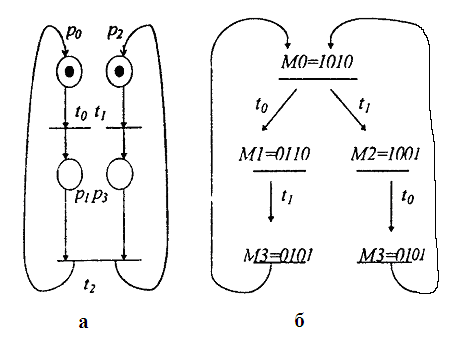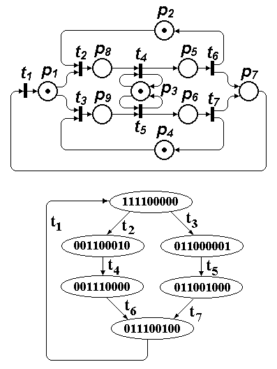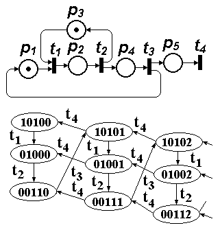 Рис. 2. Сеть Петри и ее граф достижимости для примера 2 Пример 3 На рис. 3 представлены сеть Петри и ее граф достижимости из работы [1].