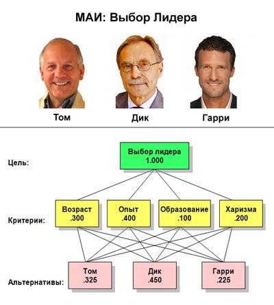 Пример задачи многокритериального выбора с простейшей иерархией. В данной задаче необходимо выбрать из трех кандидатов одного на должность руководителя. Кандидаты оцениваются по критериям: возраст, опыт, образование и личные качества. На рисунке показана иерархия для этой задачи. Простейшая иерархия содержит три уровня: цель, критерии и альтернативы. Числа на рисунке показывают приоритеты элементов иерархии с точки зрения цели, которые вычисляются в МАИ на основе парных сравнений элементов каждого уровня относительно связанных с ними элементами вышерасположенного уровня. Приоритеты альтернатив относительно цели (глобальные приоритеты) вычисляются на заключительном этапе метода путем линейной свертки локальных приоритетов всех элементов. В данном примере лучшим кандидатом является Дик, так как имеет максимальное значение глобального приоритета. Метод Анализа Иерархий (МАИ) — математический инструмент системного подхода к сложным проблемам принятия решений. МАИ не предписывает лицу, принимающему решение (ЛПР), какого-либо «правильного» решения, а позволяет ему в интерактивном режиме найти такой вариант (альтернативу), который наилучшим образом согласуется с его пониманием сути проблемы и требованиями к ее решению. Этот метод разработан американским математиком Томасом Саати, который написал о нем книги, разработал программные продукты и в течение 20 лет проводит симпозиумы ISAHP (англ. International Symposium on Analytic Hierarchy Process). МАИ широко используется на практике и активно развивается учеными всего мира. В его основе наряду с математикой заложены и психологические аспекты. МАИ позволяет понятным и рациональным образом структурировать сложную проблему принятия решений в виде иерархии, сравнить и выполнить количественную оценку альтернативных вариантов решения. Метод Анализа Иерархий используется во всем мире для принятия решений в разнообразных ситуациях: от управления на межгосударственном уровне до решения отраслевых и частных проблем в бизнесе, промышленности, здравоохранении и образовании. Для компьютерной поддержки МАИ существуют программные продукты, разработанные различными компаниями. Анализ проблемы принятия решений в МАИ начинается с построения иерархической структуры, которая включает цель, критерии, альтернативы и другие рассматриваемые факторы, влияющие на выбор. Эта структура отражает понимание проблемы лицом, принимающим решение. Каждый элемент иерархии может представлять различные аспекты решаемой задачи, причем во внимание могут быть приняты как материальные, так и нематериальные факторы, измеряемые количественные параметры и качественные характеристики, объективные данные и субъективные экспертные оценки [1]. Иными словами, анализ ситуации выбора решения в МАИ напоминает процедуры и методы аргументации, которые используются на интуитивном уровне. Следующим этапом анализа является определение приоритетов, представляющих относительную важность или предпочтительность элементов построенной иерархической структуры, с помощью процедуры парных сравнений. Безразмерные приоритеты позволяют обоснованно сравнивать разнородные факторы, что является отличительной особенностью МАИ. На заключительном этапе анализа выполняется синтез (линейная свертка) приоритетов на иерархии, в результате
