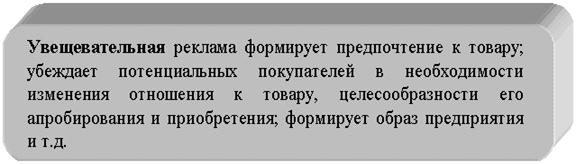В соответствии с задачамирекламы выделяют следующие её виды: Престижную (имидж) рекламу - обычно осуществляется путем контактов с представителями прессы или электронных средств массовой информации. При этом каждое упоминание о предприятии, является рекламным объявлением. Имидж-реклама, как правило, шире других видов рекламы, это реклама "впрок", она направлена не только на непосредственных покупателей, но и на более широкие слои населения для того, чтобы при расширении сферы деятельности вызывать положительные эмоции у покупателей. Причем, рекламироваться может и деятельность предприятия в сфере охраны окружающей среды, спонсорской деятельности и т.д. Внутрифирменную рекламу - направленную на внушение сотрудникам веры в собственное предприятие, создание у них чувства тесной взаимосвязи своей с ним, с тем, чтобы они сами стали активными пропагандистами своего предприятия. Стимулирующую рекламу - направленную, на стимулирование потребностей покупателей, ее направленность ограничена пользователями продукции предприятия. Это самый распространенный вид рекламы, в ней важно подчеркнуть основные преимущества продукции предприятия, их положительные качества по сравнению с аналогичными товарами.