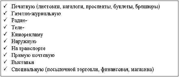 В зависимости от целевой ауд иториивыделяют следующие виды рекламы: Потребительская реклама - направлена на аудиторию, которая приобретает продукт для личного потребления, а не для перепродажи. Потребительскими является большая часть рекламных сообщений средств массовой информации. Деловая реклама - нацелена на производственных потребителей, посредников, профессионалов. Часто говорят, что деловая реклама невидима. Деловая реклама, в свою очередь, может быть: 1. промышленной - направлена на клиентов, которые занимаются закупкой или оказывают влияние на сферу приобретения товаров производственного назначения; 2. торговой - направлена на посредников в розничной или оптовой торговле с целью стимулирования продаж товара оптом или в розницу; 3. профессиональной - нацелена на юридических и физических лиц, работающих в сфере услуг, например, специалистов сферы общественного питания, медицинских работников и т.д. 4. сельскохозяйственной - нацелена на фермеров. Этот вид рекламы развит в большей степени в странах, где высока доля продукции сельского хозяйства в валовом продукте. Основное отличие потребительской рекламы от промышленной, заключается в том, что первая является для рекламодателя практически единственным способом контакта с потенциальным потребителем, а вторая, как часть общего комплекса маркетинга, призвана лишь пробудить интерес у потенциального покупателя. В зависимости от охвата аудиторииреклама может быть: Международной - применяется для проникновения и закрепления продукта на внешних рынках. Общенациональной - используется для убеждения потребителей всей страны или нескольких регионов государства, при этом для призыва покупать свой товар предприятие может использовать журналы, телевидение, радио, охватывающие большое географическое пространство. Региональной - рекламная кампания в этом случае охватывает один регион, например, одну область. Такой вид рекламы применяется в тех случаях, когда нет необходимости привлекать внимание потребителей всей страны. Например, если авиапредприятие в состоянии провести обработку посевов фермеров с воздуха в пределах одного региона, то для рекламы своих услуг она может приобрести рекламное место в издании, распространяемом на этой территории, или купить эфирное время с трансляцией на данную область, а не на всю страну; Местной - обычно, в такой рекламе предприятия звучит призыв к приобретению товаров в конкретном магазине. По характеру воздействия на аудиторию: Прямую рекламу - "жесткая продажа" используется для извещения населения о скидках. Косвенную рекламу называют "мягкой продажей". Такой рекламой является, например, показ в фильме определенной марки продукта или помещение в печатных органах положительной статьи о деятельности предприятия или о качестве его продукта; По каналам распространенияреклама делится на: