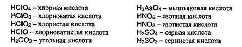 Номенклатура и классификация кислот. Поскольку существуют различные определения кислот, то их классификация и номенклатура довольно условны. По числу атомов водорода, способных к отщеплению в водном растворе, кислоты делят на одноосновные (например, HF, HNО2), двухосновные (Н2СО3, H2SO4) и трехосновные (Н3РО4). По составу кислоты делят на бескислородные (HCI, H2S) и кислородсодержащие (НСlО4, НClО3). Обычно названия кислородных кислот производятся от названия неметалла с прибавлением окончаний -ноя, -вал, если степень окисления неметалла равна номеру группы. По мере понижения степени окисления суффиксы меняются в следующем порядке: -оватая, -истая, -оватистая: