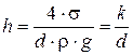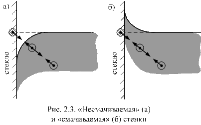 – если взаимное притяжение двух молекул жидкости велико по сравнению с притяжением молекул жидкости к частице твердой стенки, то получаем схему, изображенную на рис. 2.3, а (случай «несмачиваемой стенки»); – если взаимное притяжение двух молекул жидкости мало по сравнению с притяжением молекул жидкости к частице твердой стенки, то получаем схему, изображенную на рис. 2.3, б (случай «смачиваемой стенки»). Высота подъема смачивающей жидкости (или опускание несмачивающей жидкости) в стеклянной трубке диаметром d определяется по формуле для полусферического мениска: