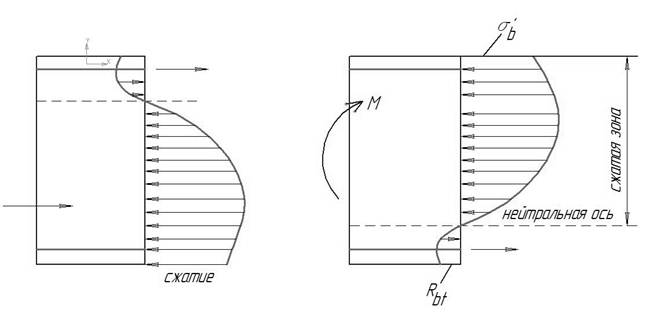 Рисунок 5.2 – Стадии напряженного состояния в нормальных сечениях балки без предварительного напряжения в зоне чистого изгиба