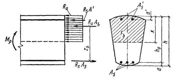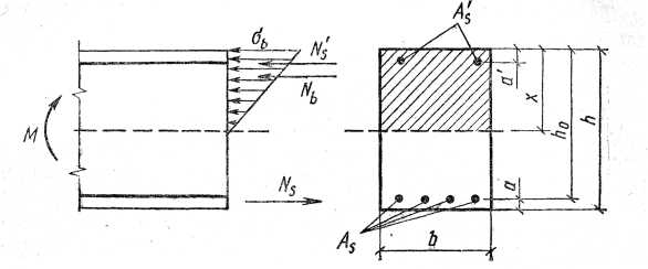 где h0 = h – а – рабочая (полезная) высота сечения; h – полная высота сечения а – расстояние от оси, нормальной к плоскости изгиба и проходящей через центр тяжести сечения растянутой арматуры, до внешнего растянутого края сечения; а' – расстояние от оси, нормальной к плоскости изгиба и проходящей через центр тяжести сечений сжатой арматуры, до внешнего сжатого края сечения.