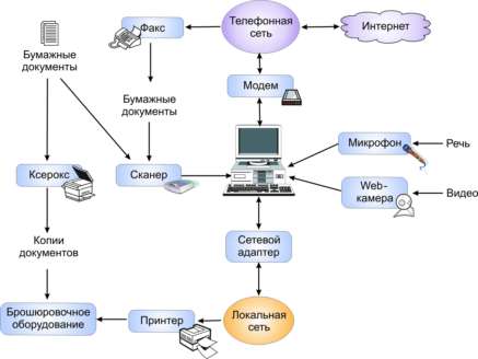 Значительная часть информации поступает в ПК по сети в виде электронных писем, а также скачивается сотрудниками с Web-страниц. Все больше офисных компьютеров оборудованы Web-камерами - цифровыми камерами, позволяющими создавать фотографии и видеоролики, которые можно передавать по сети. Специальные программы в сочетании с использованием Web-камер дают возможность организовывать видеоконференции - обсуждения, при которых сотрудники рабочих групп могут видеть друг друга и обсуждать что-либо по сети. Для участия в видеоконференциях также требуется микрофон. Микрофон необходим еще и для того, чтобы послать голосовое сообщение по электронной почте, озвучить презентацию. Современные офисные программы, в том числе программы Microsoft Office, уже имеют функции распознавания речи. Пока эти технологии развиты слабо, однако со временем голосовое управление компьютером и надиктовывание текстов наверняка получит широкое распространение.