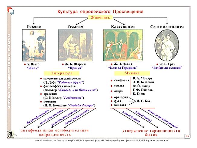 Стили эпохи Просвещения: классицизм, рокко, сентиментализм, барокко, реализм, ампир-наследник классицизма.