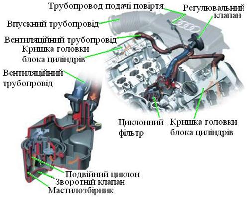 Підводні канали повітря, відвідні трубопроводи картерних газів, фільтри та мастильні уловлювачі. Під час роботи двигуна в його картер пропускається з циліндрів деяка кількість газів через нещільності поршневих кілець. Картерні гази складаються з пальної суміші, а також продуктів повного або часткового згорання. Кількість газів, які прориваються в картер, збільшується із збільшенням навантаження двигуна, а також по мірі зносу циліндрів, поршнів та поршневих кілець. Пари пального в картерних газах розріджують мастило і погіршують його мастильні властивості. Водяні пари викликають пінення мастила і появу емульсії, що затрудняє доступ мастила до поверхонь тертя. Інші компоненти відпрацьованих газів утворюють в мастилі смоляні речовини і кислоти. Кислоти викликають корозію поверхонь тертя. Крім того, картерні гази підвищують тиск в картері, що приводить до витискування мастила через ущільнення. Враховуючи, що картерні гази токсичні, у сучасних автомобільних двигунів переважно застосовують закриті (примусові) системи їх вентиляції у впускний трубопровід системи живлення та подальшим направленням у циліндри двигуна для спалювання. Картерні гази відводяться в атмосферу (КамАЗ-740, ГАЗ - 66).