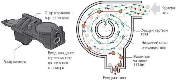 Циклонний очищувач картерних газів є примусовою (закритою) системою вентиляції картера з направленням очищених картерних газів у впускний колектор та циліндри двигуна. Циклонні очищувачі картерних газів знаходять все більше застосування в автомобільних двигунах.