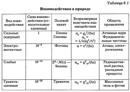 Все отмеченные выше структурные объекты мира объединяются в системы вследствие взаимодействий между собой. Под взаимодействием в более узком смысле понимают такие процессы, в ходе которых между взаимодействующими структурами и системами происходит обмен квантами определенных полей, энергией, а иногда и информацией. В природе существуют качественно различные системы связанных объектов. Ядра — связанные системы протонов и нейтронов; атомы — связанные ядра и электроны; макротела — совокупность атомов и молекул; Солнечная система — "связка" планет и массивной звезды; галактика — "связка" звезд. Наличие связанных систем объектов говорит о том, что должно существовать нечто такое, что скрепляет части системы в целое. Чтобы "разрушить" систему частично или полностью, нужно затратить энергию. Взаимное влияние частей системы или структурных единиц происходит посредством полей (гравитационного, электрического, магнитного и других) и характеризуется энергией взаимодействия. В настоящее время принято считать, что любые взаимодействия каких угодно объектов могут быть сведены к ограниченному классу четырех основных видов фундаментальных взаимодействий: сильному, электромагнитному, слабому и гравитационному. Интенсивность взаимодействия принято характеризовать с помощью так называемой константы взаимодействия, которая представляет собой безразмерный параметр, определяющий вероятность процессов, обусловленных данным видом взаимодействия. Отношение значений констант дает относительную интенсивность соответствующих взаимодействий. Кратко охарактеризуем каждый из этих четырех видов взаимодействий. Сильные (ядерные) взаимодействия. Наличие в ядрах одинаково заряженных протонов и нейтральных частиц говорит о том, что должны существовать взаимодействия, которые гораздо интенсивнее электромагнитных, ибо иначе ядро не могло образоваться. Эти взаимодействия (их называют сильными) проявляются лишь в пределах ядра. Этот вид взаимодействия обеспечивает связь нуклонов в ядре. Константа сильного взаимодействия имеет величину порядка 1. Наибольшее расстояние, на котором проявляется сильное взаимодействие (радиус действия Электромагнитные взаимодействия. Ими обусловлены связи в атомах, молекулах и обычных макротелах. Энергия ионизации атома, т. е. энергия отрыва электрона от ядра, определяет значение электромагнитного взаимодействия, существующего в атоме. Теплота парообразования, т. е. энергия перехода жидкость — пар (при атмосферном давлении), определит, правда довольно грубо, значение межмолекулярных взаимодействий в теле. Последние же имеют электромагнитное происхождение. Константа взаимодействия равна 10-3. Радиус действия не ограничен ( Слабое взаимодействие. Это взаимодействие ответственно за все виды Р-распада ядер (включая е-захват), за многие распады элементарных частиц, а также за все процессы взаимодействия нейтрино с веществом. Константа взаимодействия равна по порядку величины 10-15. Слабое взаимодействие, как и сильное, является короткодействующим. Как отмечалось, из большого списка элементарных частиц только электрон, протон, фотон и нейтрино всех типов являются стабильными. Под влиянием "внутренних причин" нестабильные свободные частицы за те или иные характерные времена превращаются в другие части
