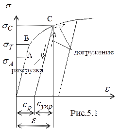Рассмотрим поведение упрочняющегося материала при нагружении и разгрузке при условии, что диаграмма деформирования при растяжении имеет вид, показанный на рис.5.1. Если при первоначальном нагружении напряжение меньше предела текучести (точка А на рис.5.1), то материал деформируется упруго. Когда напряжение достигает предела текучести