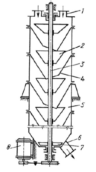 В прямоточных смесителях компоненты смешиваются за счет хаотических перемещений частиц в поперечных сечениях потока, проходящего вдоль смесителя. В продольном направлении потока частицы движутся практически с одинаковой скоростью, то есть без продольного их перемешивания. Подобный режим называют «поршневым». При таком режиме движения смешиваемого материала смеситель непрерывного действия не способен сглаживать входные флуктуации потоков компонентов, поэтому эту группу СНД необходимо комплектовать дозаторами повышенной точности. Центробежный прямоточный смеситель Центробежный прямоточный смеситель конструкции A.M. Ластовцева состоит из следующих основных элементов (рис. 22): корпуса цилиндрической формы, штуцеров для загрузки и выгрузки; вала, на котором закреплены конусы; конических пересыпных воронок, закрепленных внутри корпуса; привода вала; радиальной лопасти. Подлежащий смешиванию материал вводится через штуцер внутрь первого вращающегося конуса. Под действием центробежных сил материал поднимается по внутренней поверхности конуса и затем сбрасывается с его края в виде пылевидного факела. После удара о стенку корпуса частицы материала оседают на неподвижную воронку и по ней ссыпаются в нижележащий вращающийся конус, где процесс повторяется на каждой паре: конус–воронка. Разгрузка готовой смеси происходит через штуцер с по- мощью вращающей лопасти, закрепленной на валу. Экспериментально установлено, что для порошкообразных материалов центробежное ускорение на краю конусов должно быть равным