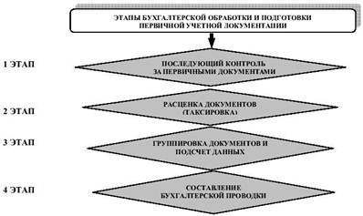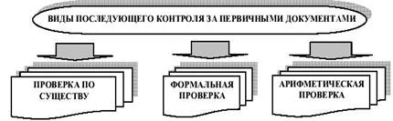 Рис. 2. Этапы бухгалтерской обработки и подготовки первичной учетной документации. 1 ЭТАП: Последующий контроль организуется для оправдательных документов как внутреннего, так и внешнего характера. Обычно такой контроль ведется работниками бухгалтерской службы, функциональные обязанности которых состоят в ведении бухгалтерского учета по отдельным участкам. Последующий контроль включает проверку первичных учетных документов по существу, формальную проверку и арифметическую проверку (рис. 3).