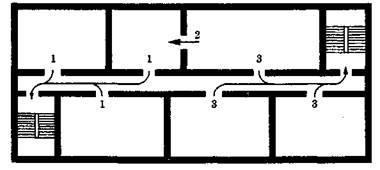 Рис. 7.4. Эвакуационные выходы из помещений второго этажа и выше расположенных этажей: 1 - выход из помещения в коридор, который ведет к лестничной клетке, которая имеет непосредственно выход наружу; 2 - выход в соседнее помещение; 3 - выход из помещения в коридор, который ведет к лестничной клетке, которая имеет выход через вестибуль, отделенный от коридора перегородкой с дверями Эвакуационные выходы должны располагаться рассредоточено. Минимальное расстояние L между наиболее отдаленными один от другого эвакуационными выходами из помещения можно определять по формуле