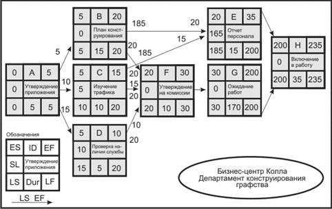 Рис. 10.8. Сетевой график для проекта создания бизнес-центра с указанием резервов времени выполнения операций