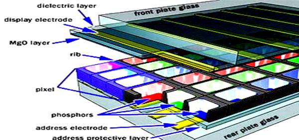 Оба комплекта электродов проходят через всю панель. Дисплейные электроды размещены в горизонтальных колонках вдоль экрана, а адресные электроды размещены в вертикальных колоннах. На Рис. 5 показано, как вертикальные и горизонтальные электроды формируют основную сетку.