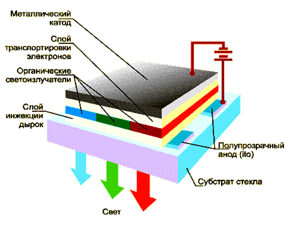 Технология OLED-дисплеев во многом напоминает LCD. Экран точно так же представляет собой матрицу из однотипных ячеек, где каждый OLED-излучатель напоминает своеобразный бутерброд (Рис. 3). Снизу находится подложка из стекла, на нее наносится слой полупрозрачного анода, за ним следует слой органического вещества (слой инжекции «дырок» - положительных зарядов), затем органические светоизлучатели, далее слой транспортировки электронов и сверху все это накрывается катодом. При подаче напряжения анод и катод начинают одновременно инжектировать дырки (положительные заряды) и электроны (отрицательные заряды) в органический слой, где происходит их рекомбинация, в результате чего выделяется энергия, большая часть которой высвобождается в форме света.