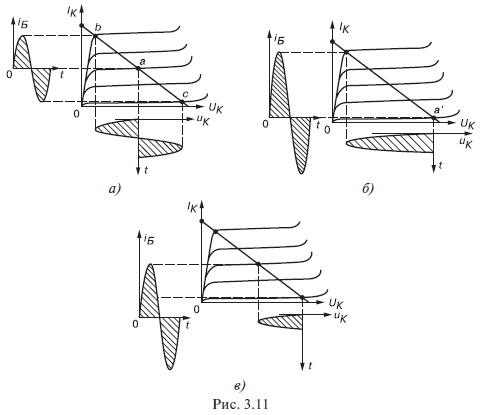 В зависимости от положения рабочей точки а в режиме покоя на семействе выходных характеристик транзисторов и уровня входных сигналов (ивх, івх) различают три основных режима (или класса) работы усилителей: А, В и С. Класс А характеризуется тем, что рабочую точку а выбирают посередине участка bс линии нагрузки (рис. 3.11, а), а максимальное значение амплитуды переменной составляющей входного тока (тока базы іБ) не приводит к увеличению тока коллектора іК за пределы участка bс. В этом случае нелинейные искажения усиливаемого сигнала будут минимальными, т.е. при подаче на вход синусоидального напряжения (тока) форма выходного напряжения ивых будет практически синусоидальной. Основной недостаток этого класса усиления - очень низкий КПД: