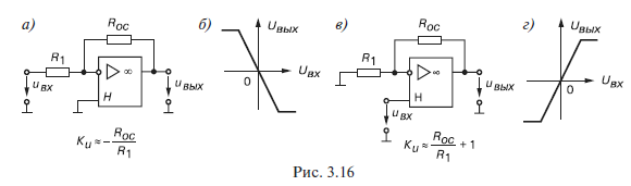 Операционный усилитель имеет два входа: инвертирующий (И) и не инвертирующий (Н). Их название связано с тем, что в первом случае выходное напряжение находится в противофазе с входным, а во втором случае - в фазе с входным напряжением. Для питания ОУ обычно используют два разнополярных источника питания +Uп и - Uп, или один биполярный источник, средняя точка трансформатора которого соединена с общей шиной, относительно которой измеряются напряжения +Uп и - Uп, равные (±6.3)÷(±15)В. Для получения нужных свойств к дополнительным выводам ОУ подключают звенья обратной связи. Подключив звено отрицательной обратной связи (ООС), состоящее из двух резисторов (делителя), например, Rос =1МОм и R1=5 кОм, между выходом и инвертирующим входом, и соединив вход Н с обшей точкой, получим инвертирующий усилитель (рис. 3.16, а), статическая амплитудная характеристика которого Uвых = f (Uвх) изображена на рис. 3.16, б. Максимальное значение напряжения