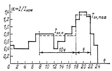 где a 1, a 2, … a n - различные ступени средних нагрузок, доли номинальной; t1, t2, … tn - длительность этих нагрузок, ч. Систематическая перегрузка трансформаторов возможна за счет неравномерной нагрузки в течение суток. На рис. 7а изображен суточный график нагрузки, из которого видно, что в ночные, утренние и дневные часы трансформатор недогружен, а во время вечернего максимума (от 18 до 22 ч) перегружен. При недогрузке износ изоляции мал, при перегрузке износ значительно усиливается. Допустимая систематическая перегрузка определяется из условия, что износ изоляции за время максимальной нагрузки и предшествующей недогрузки такой же, как при работе трансформатора при постоянной номинальной нагрузке, когда температура наиболее нагретой точки обмотки не превышает +98°С. Коэффициент допустимой систематической перегрузки определяется по выражению: