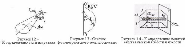 Энергетическая освещенность (облученность) - плотность лучистого потока по облучаемой поверхности Ееср = Фе/А где Ее ср - соответственно облученность участка поверхности dA и средняя облученность поверхности А, люкс (лк).Освещенность в 1 лк имеет поверхность, на 1 м2 которой падает и равномерно по ней распределяется световой поток в 1 лм.. Энергетическая яркость тела или участка его поверхности в направлении a - отношение силы излучения в направлении a к проекции излучающей поверхности на плоскость, перпендикулярную этому направлению (рисунок 1.4) Leaср = Iea/s где L e аср - яркость участка поверхности dA и поверхности А в направлении a, проекции которых на плоскость, перпендикулярную этому направлению, соответственно равны dA cosa и a; d Iea - соответственно силы света, испускаемые поверхностями dA и А в направлении a. Излучения различного спектрального состава, одинаковые по яркости для дневного зрения, будут для глаза разнояркимй (эффект Пуркине), например, голубое будет ярче красного. В области сумеречного зрения используется понятие эквивалентной яркости. Существует излучение определенного спектрального состава, для которого яркость на всех уровнях принимается пропорциональной мощности излучения, но при ином спектральном составе, равносветлое с опорным, будет иметь одинаковую с ним эквивалентную яркость, хотя стандартные яркости излучений будут различными. Эквивалентная яркость позволяет сравнивать различные излучения по их световому действию даже в условиях неопределенности функции относительной спектральной чувствительности.