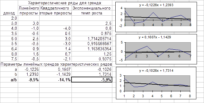 Рисунок 1‑7 иллюстрирует выбор между тремя видами тренда. Для этого рассчитаны три производных от дохода ряда. На основании параметров тренда рассчитаны коэффициенты «похожести». Наименьший (по модулю) коэффициент у ряда темпов роста (5,9%), следовательно ряд доходов описывается экспоненциальным трендом.