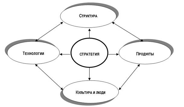 Рис. 1. Виды организационных изменений В центре схемы — стратегия, т.е. магистральный путь развития организации в каком-то конкретном промежутке времени. Стрелки же между различными видами изменений означают, что изменения в каком-то из компонентов обязательно влекут за собой изменения в других, а все они вместе влияют на изменения в стратегии организации. Технологические изменения. Их конечная задача — повышение эффективности производства товаров или услуг и связаны они чаще всего с выполнением основной производственной функции организации. С другой стороны, в современных организациях эти изменения касаются также управленческих и сервисных технологий. Речь, конечно же, идет о современных коммуникационных и информационных технологиях. Специалисты в области управления изменениями отмечают, что технологические изменения наиболее эффективны тогда, когда они осуществляются «снизу вверх»: технологические идеи возникают на низших уровнях организации и передаются на рассмотрение высшим. Попытки же насадить технологические изменения «сверху» часто заканчиваются безуспешно. Связано это с тем, что специалисты, находящиеся близко к производству, в силу этого лучше осознают возможные преимущества и перспективность новых технологий. Отсюда вывод — технологические изменения более эффективны в гибких, децентрализованных структурах, а жесткие бюрократические структуры препятствуют им. Продуктовые изменения. Изменения, которые организация производит в своих продуктовых линиях или услугах, связаны, прежде всего, с изменениями в потребностях и предпочтениях потребителей. Организация, которая уловила эти изменения и предложила рынку соответствующий продукт, приобретает серьезные конкурентные преимущества. Продуктовые изменения могут быть результатом появления новой технологии. Классический пример — появление компьютеров. С одной стороны, их создатели с большим трудом представляли, какое место может занять компьютер в повседневной жизни людей. С другой — именно появление данного продукта «спровоцировало» появление и рост целых отраслей производства и услуг. Структурные изменения. Это изменения, связанные с целями, иерархией, процедурами и структурами организации. Наиболее распространенные тенденции структурных изменений: переход от механистических к адаптивным структурам, уплощение иерархии, децентрализация управления. Изменение системы оплаты труда, пересмотр системы оценки качества работы, введение новых правил — это тоже примеры структурных изменений. В отличие от технологических, структурные изменения оказываются более эффективными тогда, когда они осуществляются «сверху вниз», так как в этом случае высший менеджмент более компетентен, чем специалисты, работающие в низовых звеньях. Культурные изменения. Это, пожалуй, наиболее медленно происходящие изменения. Здесь имеются в виду изменения в ценностях, нормах, отношениях, убеждениях и поведении членов организации. В современном менеджменте разработано достаточно много инструментов изменения культуры организационных групп и организации в целом. Один из них — «организационное развитие», подразумевающее применение специально разработанных поведенческих методов для улучшения социально-психологического климата организации и совершенствования